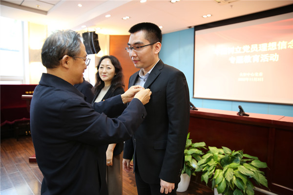活动首先宣读了科技部火炬中心党委对接收陈彦、孙翔宇、蔡子航三位同志为中共预备党员的审批意见。中心党委副书记、主任贾敬敦同志为三位预备党员佩戴党徽。中心党委委员、副主任盛延林同志带领三位预备党员进行宣誓,新党员对党和人民作出庄严承诺,全体党员一同重温入党誓词,进一步激励新老党员增强责任感和使命感,严格践行入党誓言。